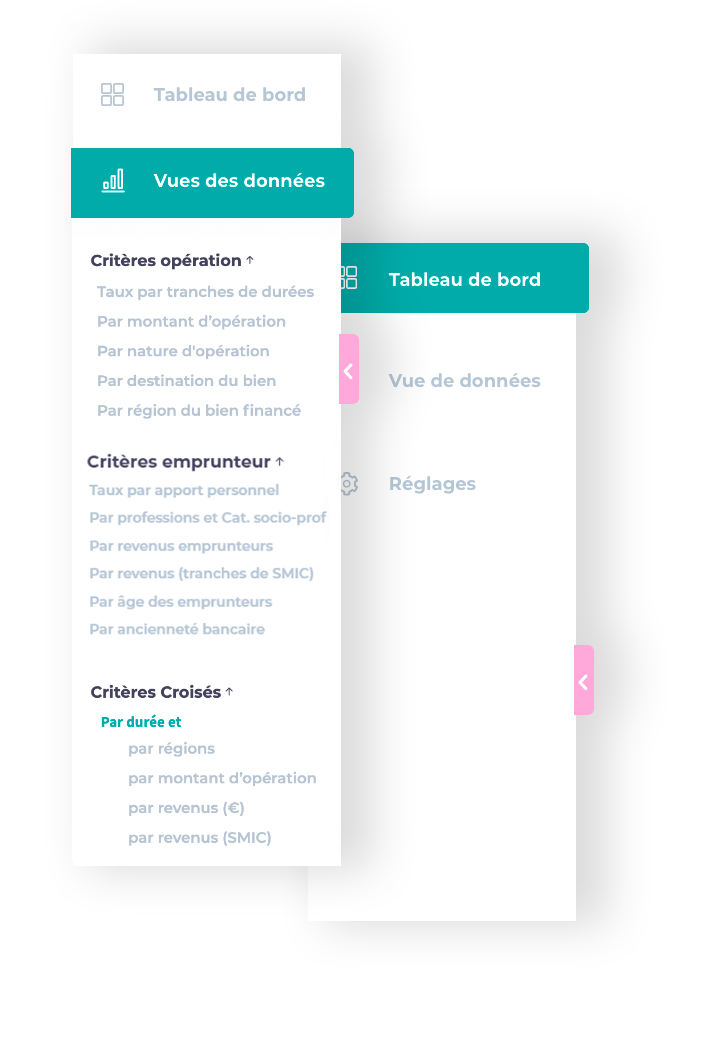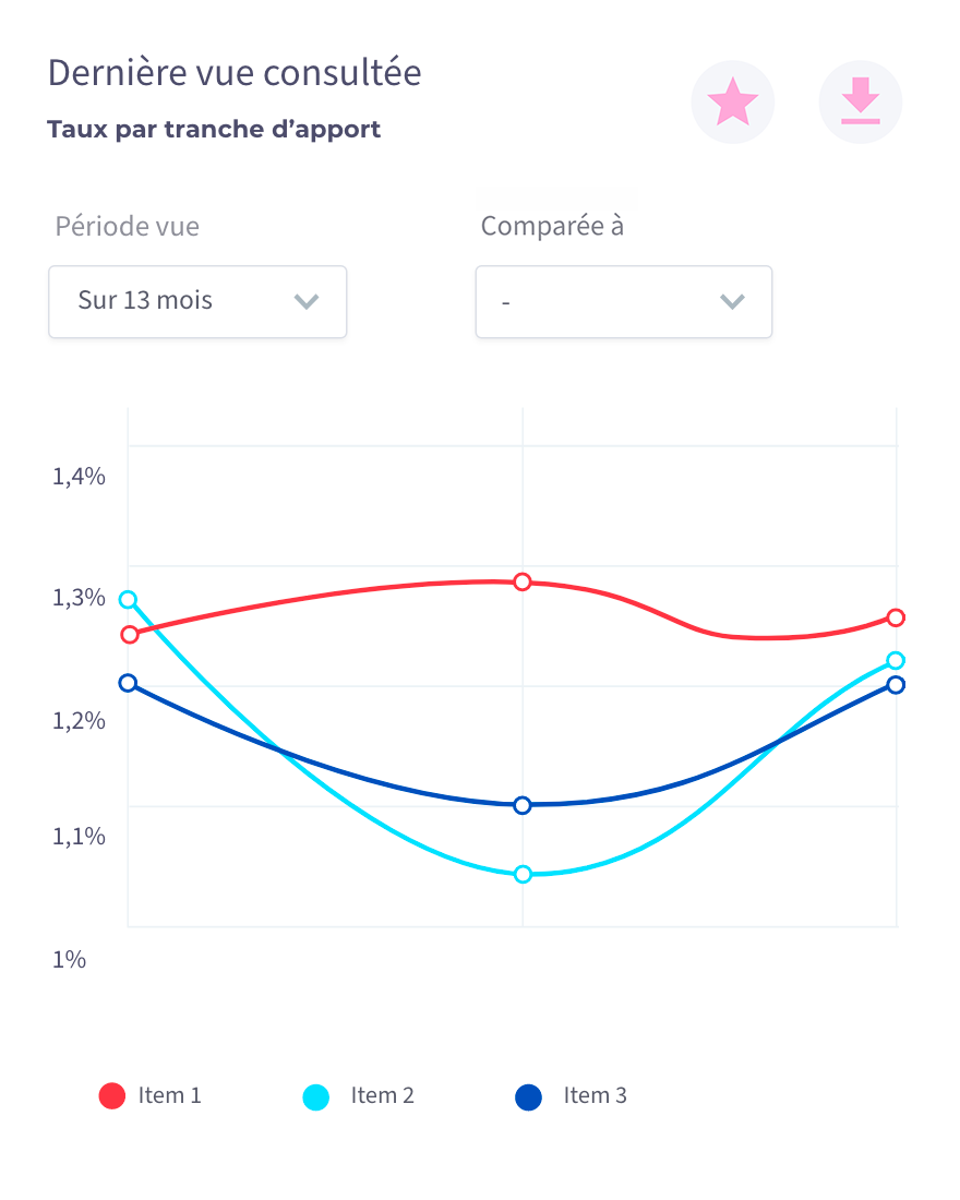 - Depuis votre espace personnel, accédez à une supervision de l’évolution des taux sur les 13 derniers mois, approfondie sur 11 critères liés à l’opération ou à l’emprunteur.